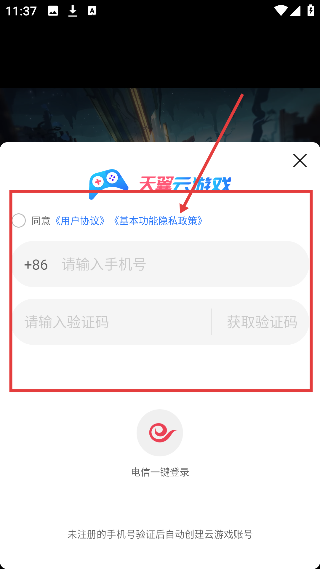3、在登录提示页面,勾选同意协议后输入手机号、验证码,完成登录,即可继续游戏啦。