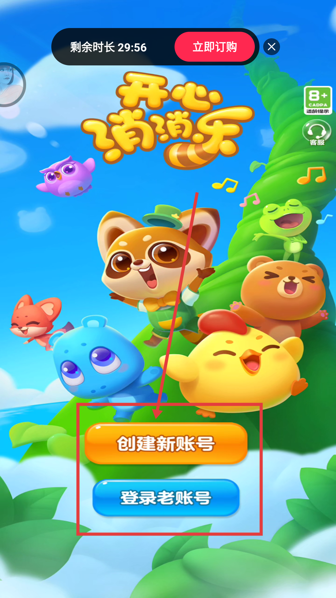 4、登录后进入游戏,可选择创建新账号或登录老账号,开启《开心消消乐》的游戏之旅哦。