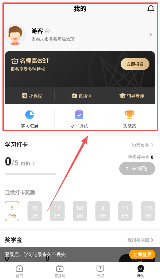 1、初次使用时,你可以先到“我的”页面查看当前状态。如果显示为游客,建议先登录以保存学习记录。