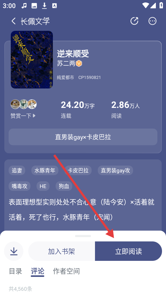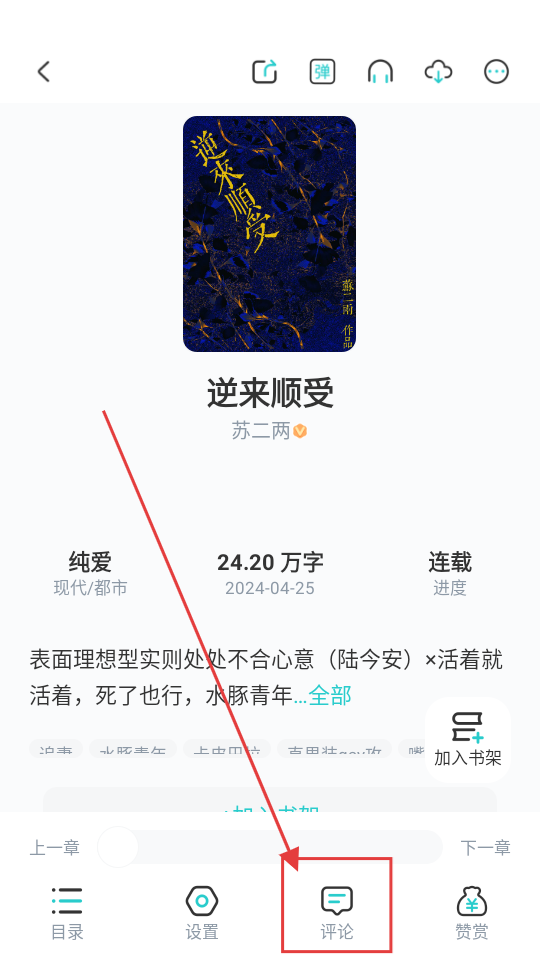 1、在《逆来顺受》作品页,点击【立即阅读】,就能开始阅读,还能参与评论互动哦。