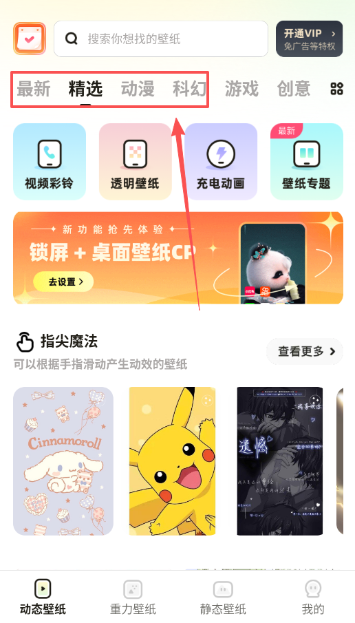 1、第一步是探索首页,顶部像标签页一样的“精选、动漫、科幻”是内容分类入口,你可以从这里开始寻找喜欢的风格。
