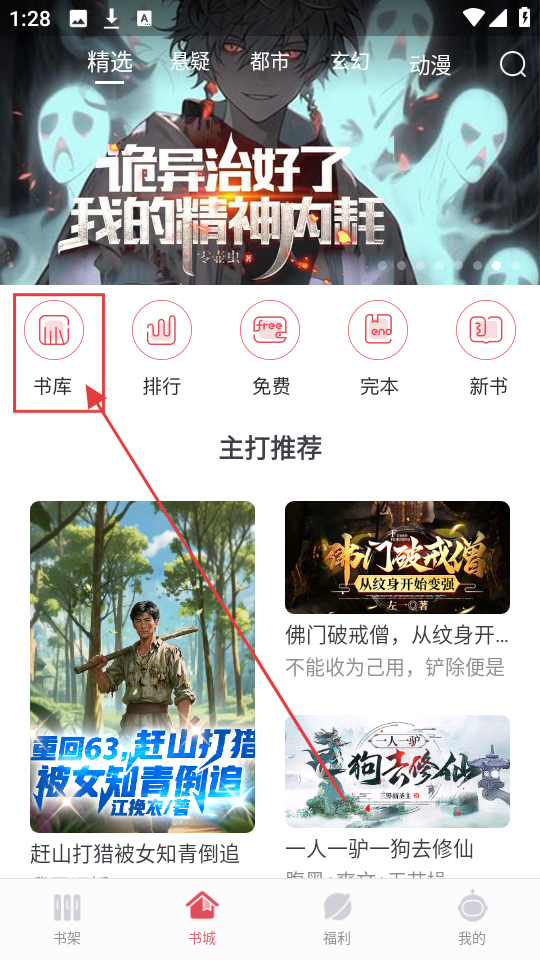 1、打开APP的书城页面,点击【书库】选项,进入书库页面,准备查找小说啦。