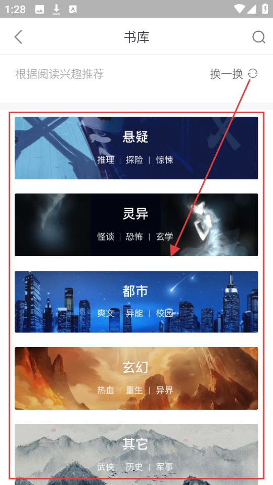2、在书库页面,选择感兴趣的分类,比如【都市】,进入都市分类页面哦。
