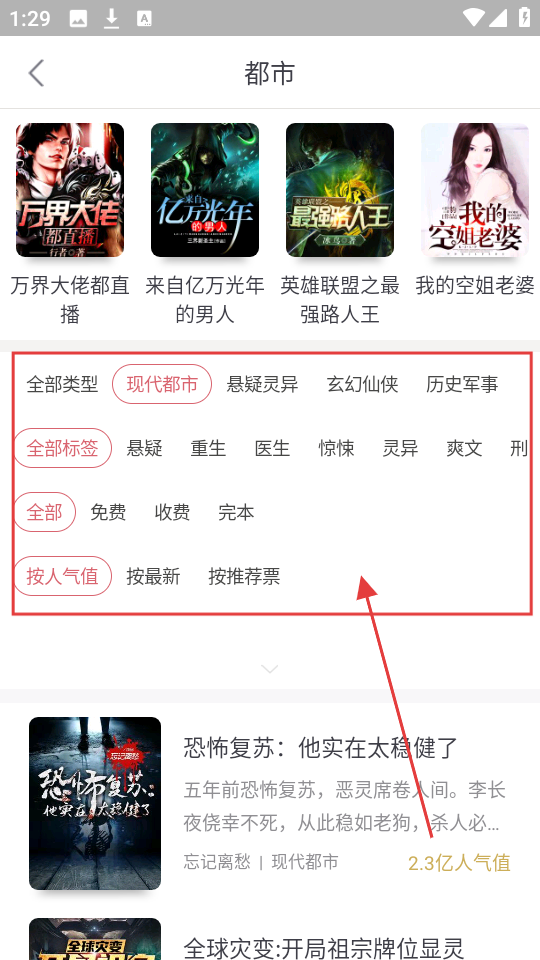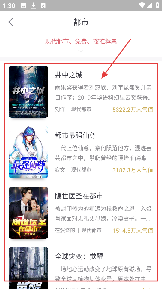 3、在都市分类页面,设置筛选条件,如【现代都市】【免费】【按推荐票】,筛选出目标小说呢。