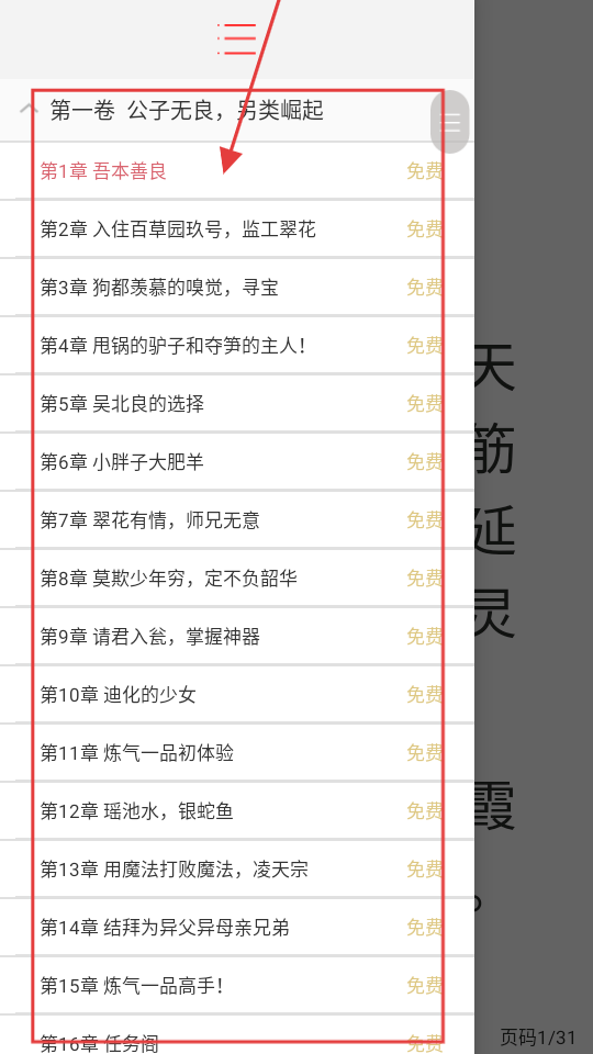 3、在目录里有好多免费章节,比如【第11章炼气一品初体验】,选它就能直接阅读啦。
