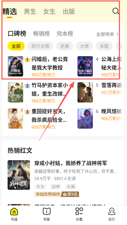 2、想找热门小说的话,就切换到“书城”页,这里有精选、男生、女生等分类,还能看到口碑榜、畅销榜等各种榜单。