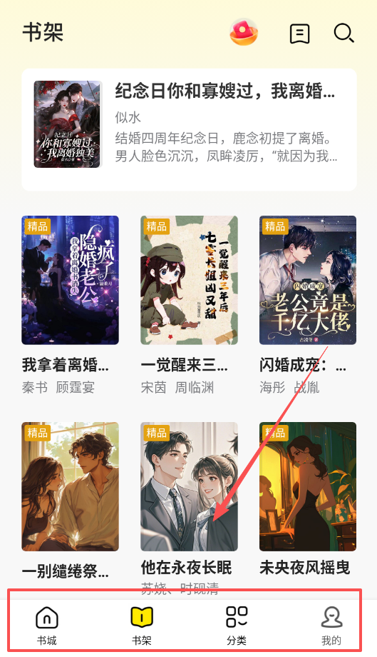 4、管理个人阅读的话,主要用“书架”功能,这里会显示你在读的书,比如“纪念日你和寡嫂过,我离婚...”,点击就能继续阅读。