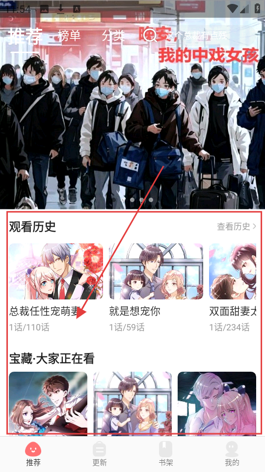 1、在软件推荐页面,有观看历史和宝藏推荐的漫画,点击感兴趣的漫画如【总裁任性宠萌妻】,可进入漫画详情页哦。