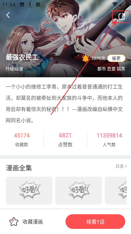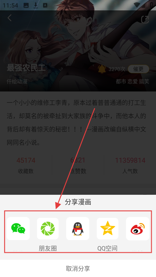 3、在漫画页面,点击右上角分享按钮,可展开分享方式列表,选择分享渠道哦。