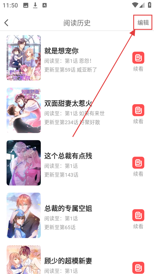 2、在阅读历史页面,点击右上角【编辑】按钮,进入编辑模式哦。
