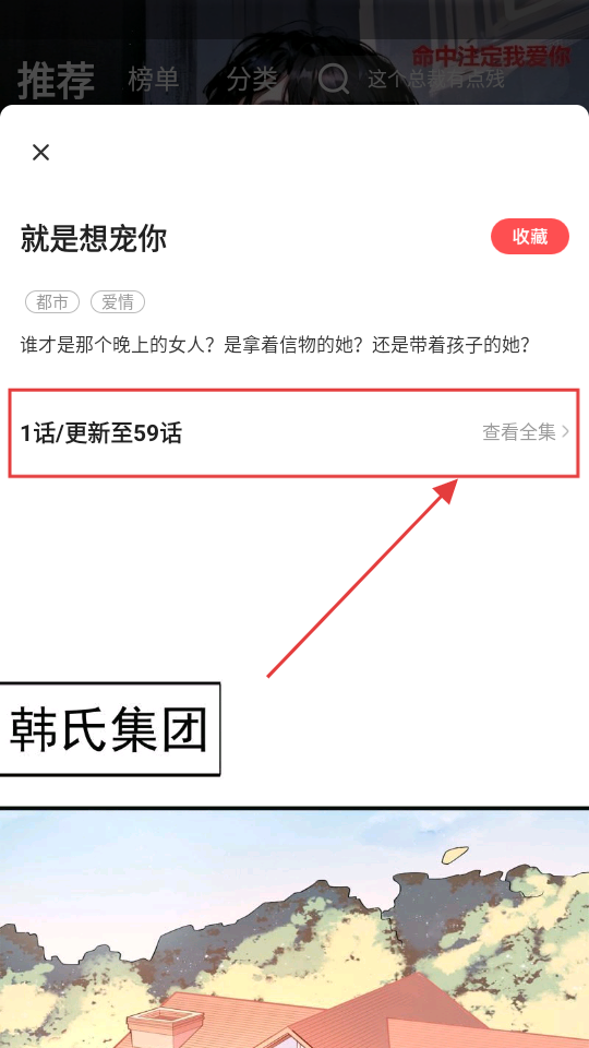 2、进入《就是想宠你》详情,看到【1话/更新至59话】,点击【查看全集】就能看到所有章节啦。