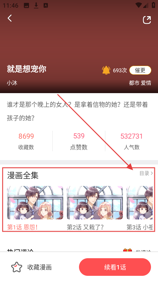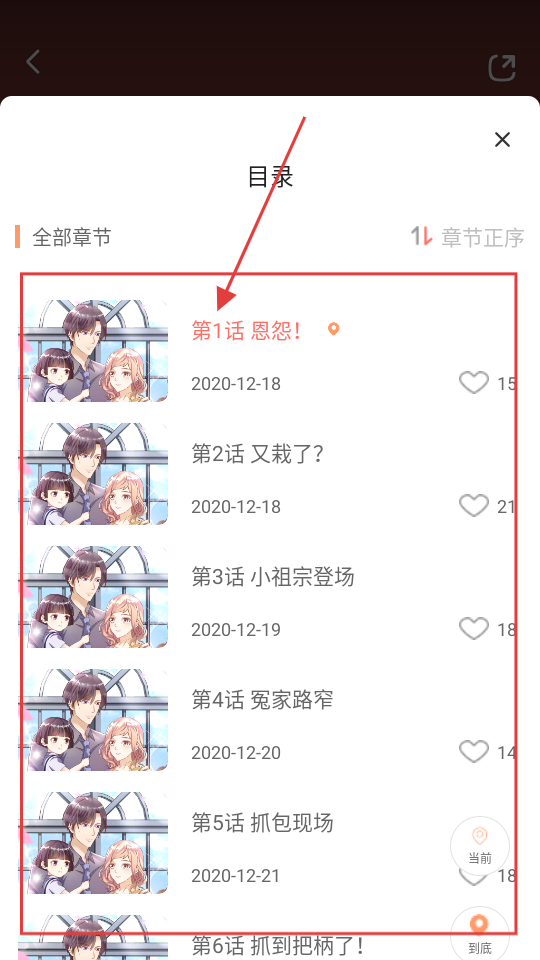 4、进入目录后,能看到每话的更新时间和点赞数,选择【第1话恩怨!】就能开始阅读啦。
