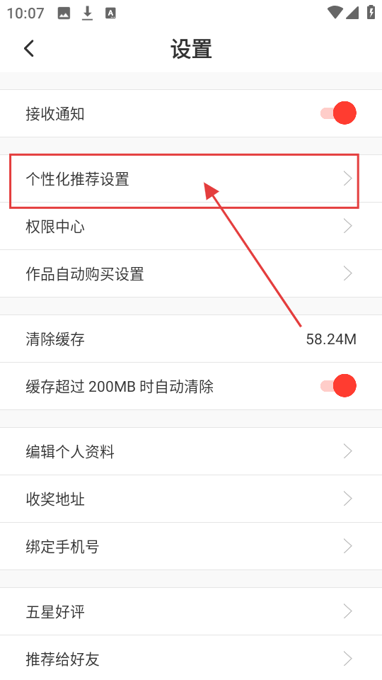 3、进入设置页面后,找到【个性化推荐设置】选项,点击它,进入个性化推荐设置详情页啦。