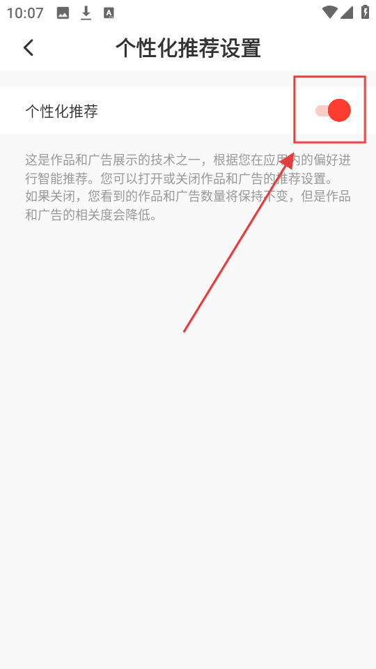 4、在个性化推荐设置详情页,点击【个性化推荐】右侧的开关按钮,就能关闭个性化推荐啦。