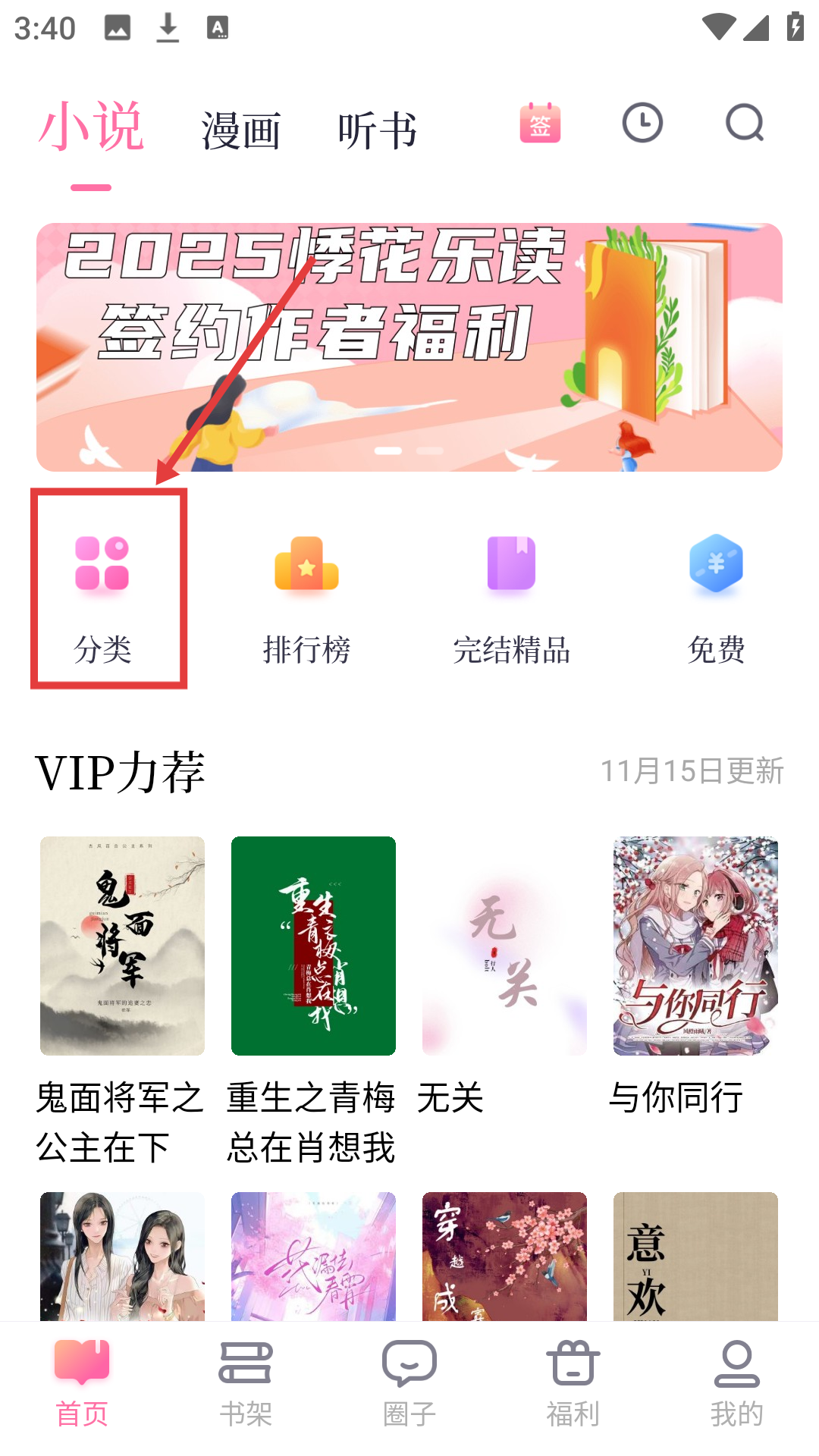 1、在小说APP首页,点击【分类】,可进入分类页面,准备挑选感兴趣的小说类别啦。