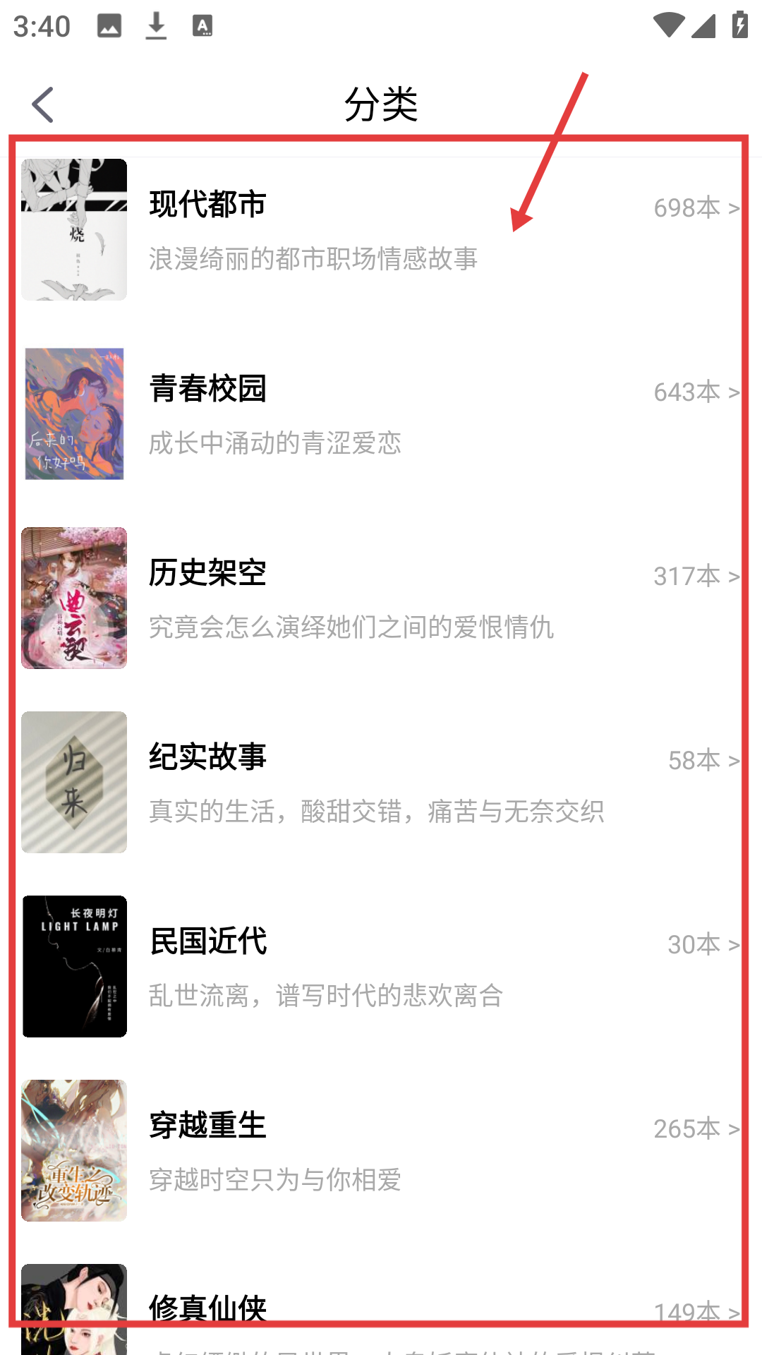 2、进入分类页面后,可选择现代都市、青春校园等类别,缩小小说搜索范围哦。