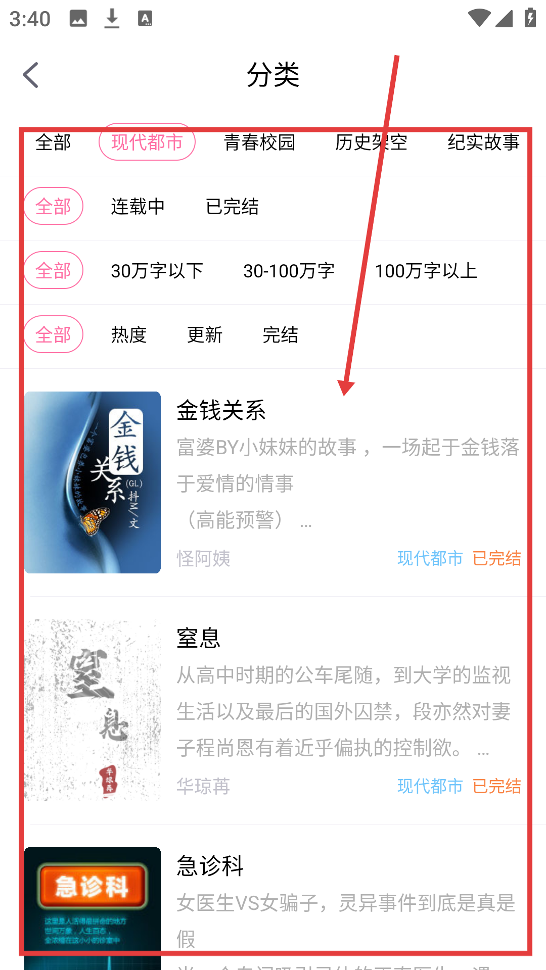 3、选择现代都市类别后,还可通过连载状态、字数等条件筛选,找到《金钱关系》等小说啦。