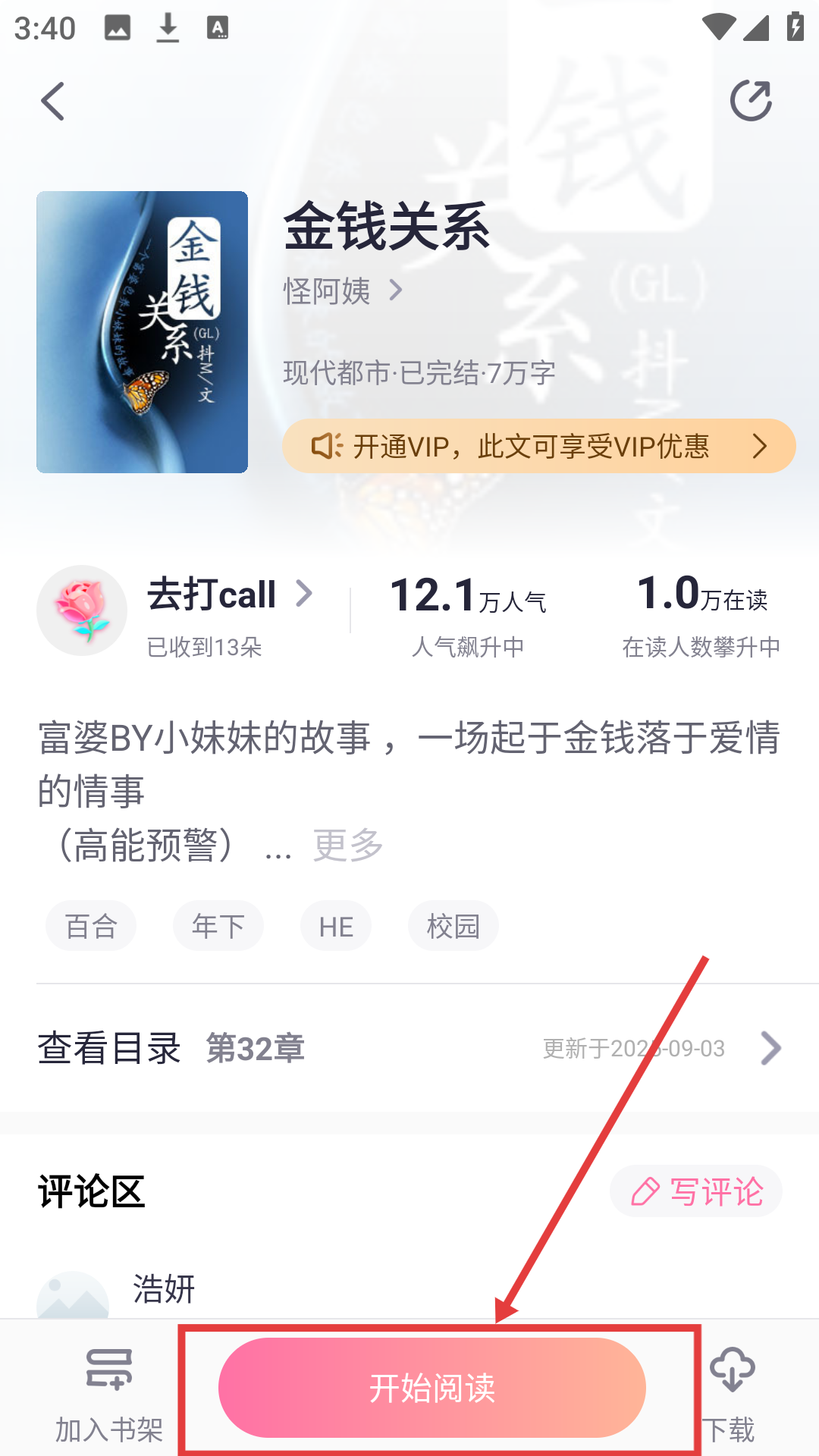 4、进入《金钱关系》详情页后,点击【开始阅读】,即可开启该小说的阅读之旅哦。