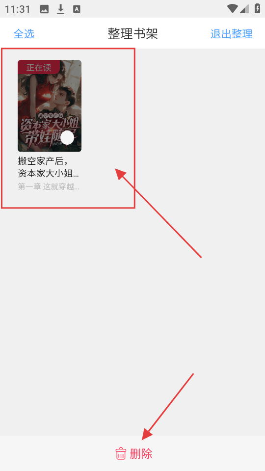 3、在整理书架时,选择要删除的书籍,然后点击【删除】按钮,就能把它从书架移除啦。