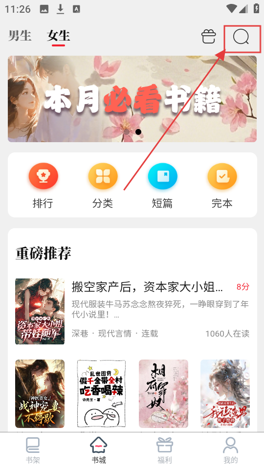 1、在书城女生页面,点击右上角搜索按钮,可进入搜索页面,准备搜索书籍啦。