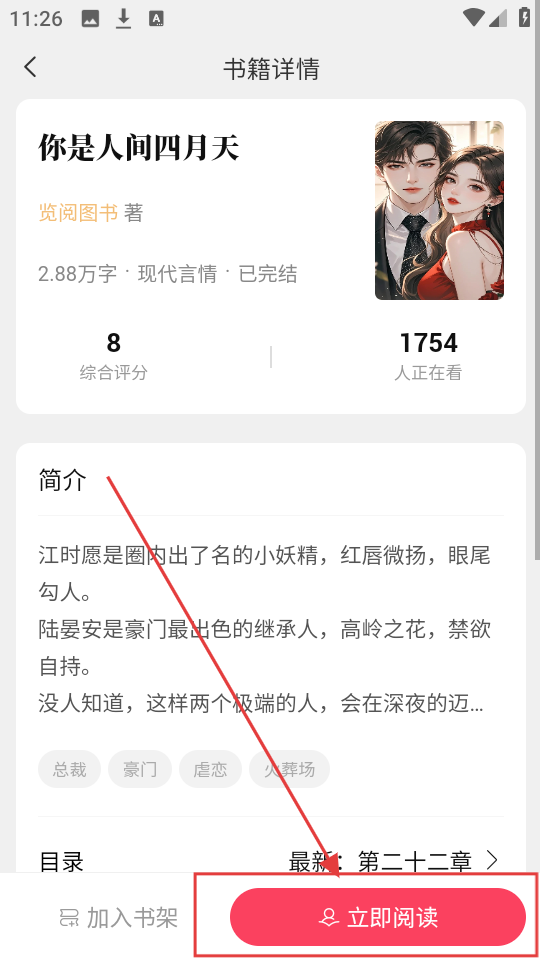 4、进入书籍详情页后,点击【立即阅读】,可进入小说阅读页面,开始阅读啦。