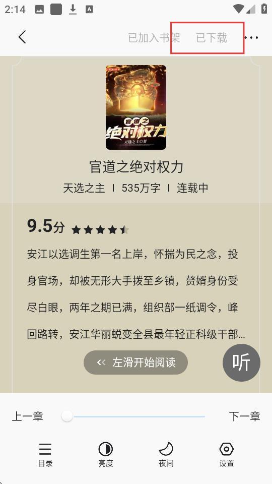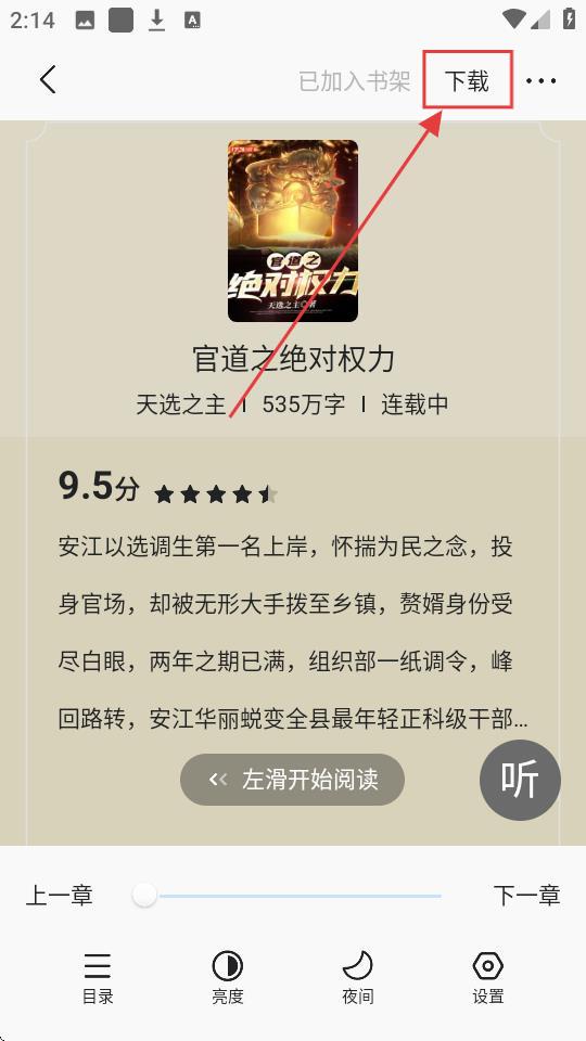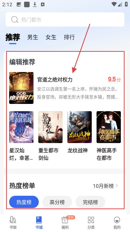 1、在书城推荐页面,点击【官道之绝对权力】书籍,可进入书籍详情页,了解书籍信息啦。