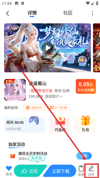 2、在游戏详情页点击底部的【点评】按钮,就能进入发布点评的页面,准备分享对游戏的看法哦。
