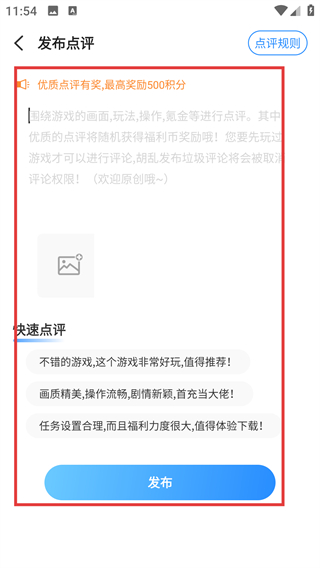 3、在发布点评页可以输入对游戏的评价,也能选快速点评模板,填好后点【发布】就能提交啦。