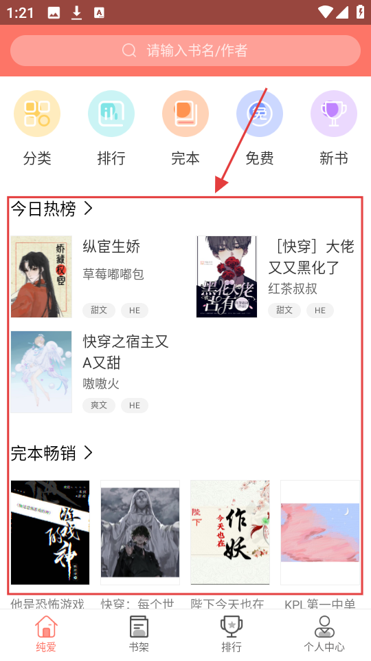 1、在软件首页,可浏览今日热榜、完本畅销等板块的书籍,找到感兴趣的书籍啦。