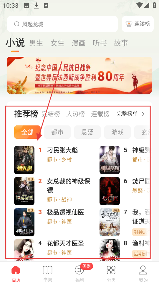 1、我们进入软件,能看到推荐榜里有不少小说,若对《刁民张大彪》感兴趣,点击它就能进入小说详情页面啦。