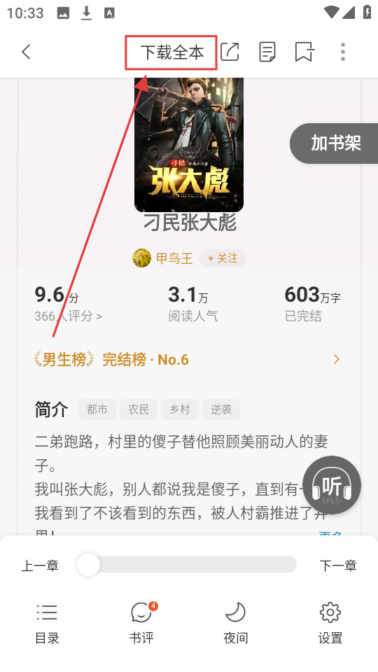 2、在《刁民张大彪》详情页,若想下载全本,点击顶部【下载全本】,即可进入下载相关界面哦。