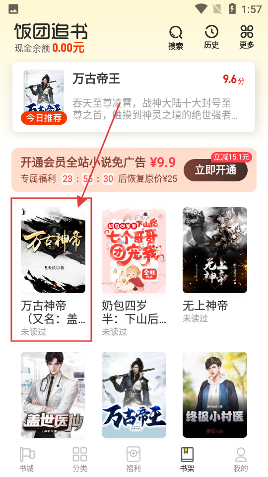 4、之后再看小说,在首页就能找到已添加的【万古神帝】,直接点击就能继续阅读,超方便。