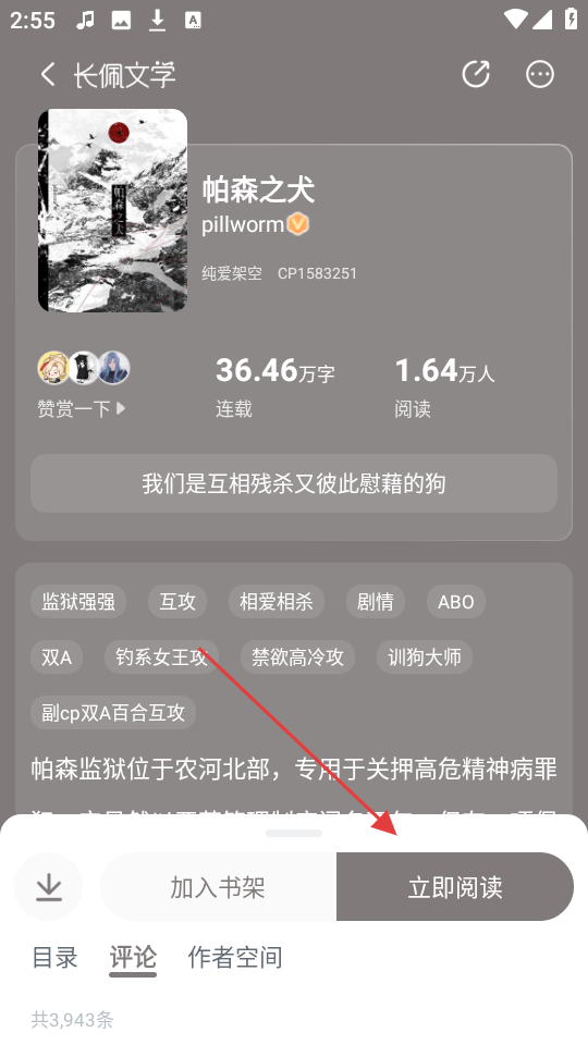 1、我们打开长佩阅读,找到《帕森之犬》,点击【立即阅读】,就能进入该书的阅读页面啦。