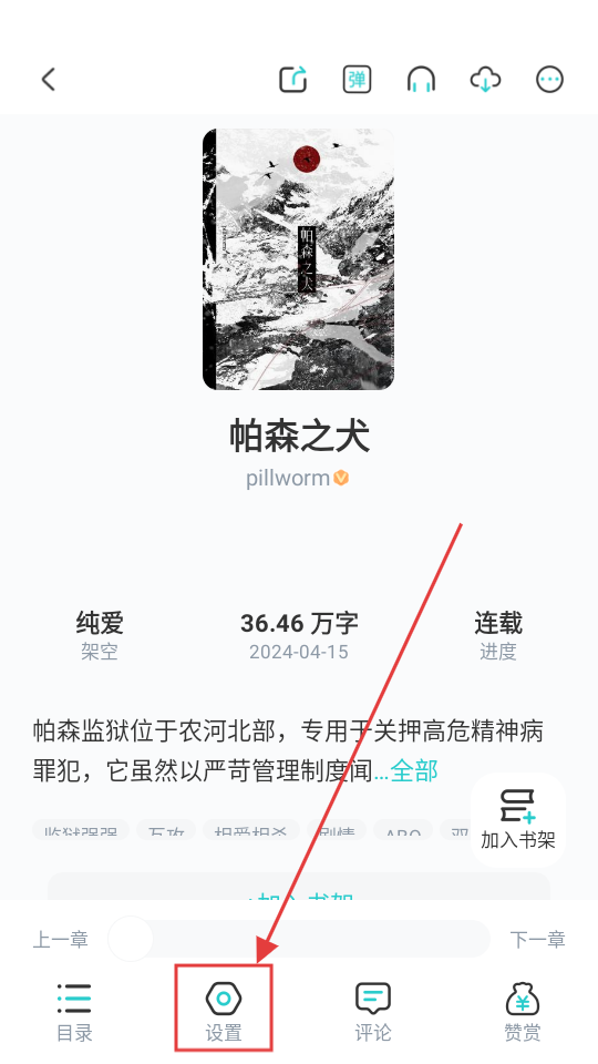 2、在《帕森之犬》阅读页面,点击【设置】按钮,就能打开阅读设置界面哦。