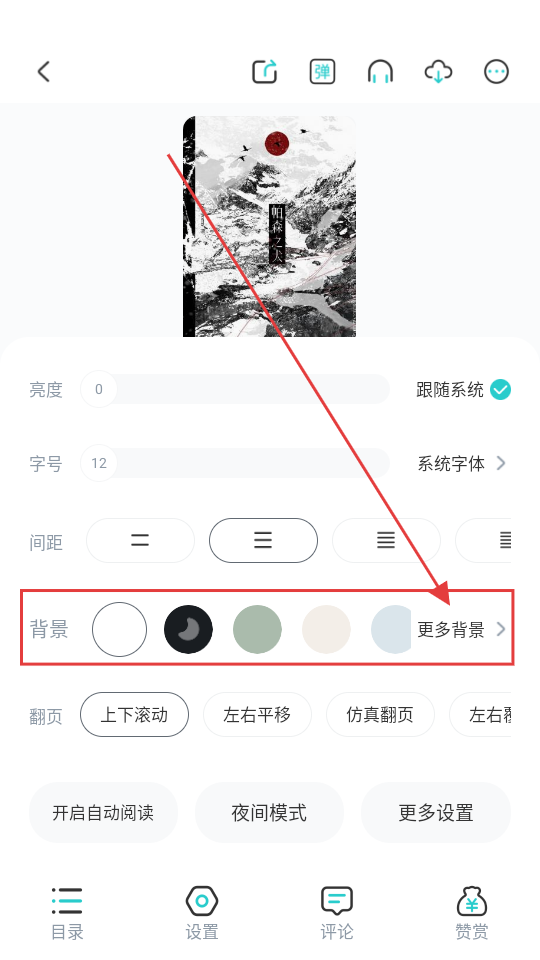 3、打开阅读设置界面后,找到背景设置区域,点击【更多背景】,就能进入阅读背景选择页面呢。
