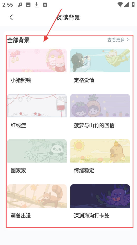 4、进入阅读背景选择页面后,可选择喜欢的背景,如小猪照镜、定格爱情等,选择后阅读背景就设置好啦。