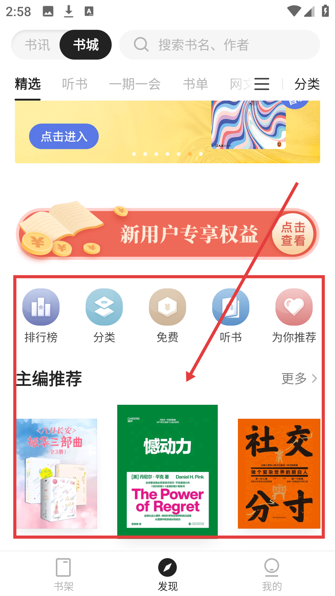 1、在书城发现页面,点击主编推荐的书籍,如《憾动力》,可进入书籍详情页,准备进行阅读或购买操作啦。