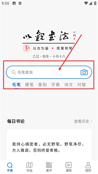 3、点底部【字典】选项,进入查询界面,用【毛笔查询】搜索框就能查找书法字体相关内容啦。