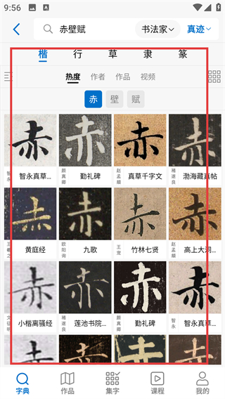 4、在查询结果页,可按书体分类查看字体,像【楷】体下的字例,能帮你学习不同书法风格哦。