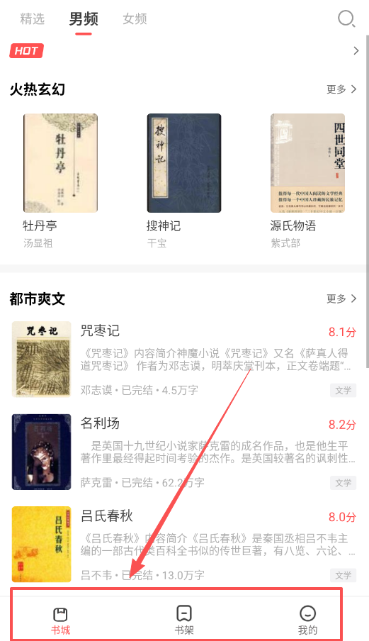 1、打开软件先看底部,有“书城”、“书架”、“我的”三个页签,默认是书城页面,里面分了男频女频和热门分类。