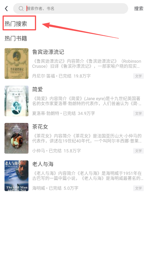 2、想找热门好书就去“热门搜索”,那里有老人与海、鲁宾逊漂流记这些经典,点进去能看到内容简介和字数。