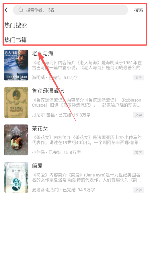 2、快速发现好书就去热门搜索,那里推荐的茶花女、简爱都是经过验证的高质量作品,点开简介扫一眼就能决定要不要读。