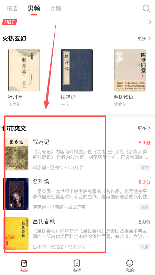 1、直接利用顶部分类找书,比如点“火热玄幻”能看到源氏物语,点“都市英文”能找到名利场和吕氏春秋。