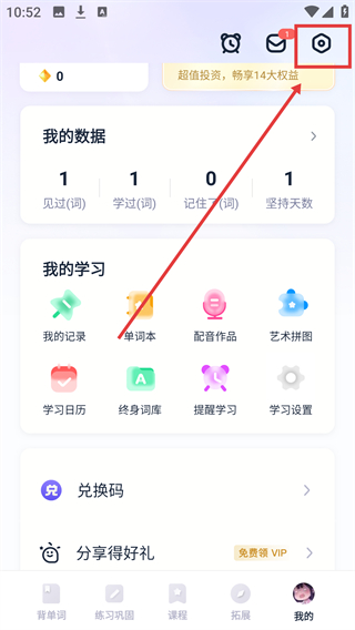 2、进入个人中心后,点击右上角的设置图标,可进入全局设置界面,调整学习参数等配置哦。