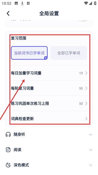 3、在全局设置页面,找到【每日加量学习词量】选项,点击即可调整每日额外学习的单词数量啦。