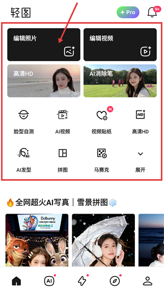 1、在轻图首页点【编辑照片】选项,可进入照片编辑页面,开启对图片的美化处理流程啦。