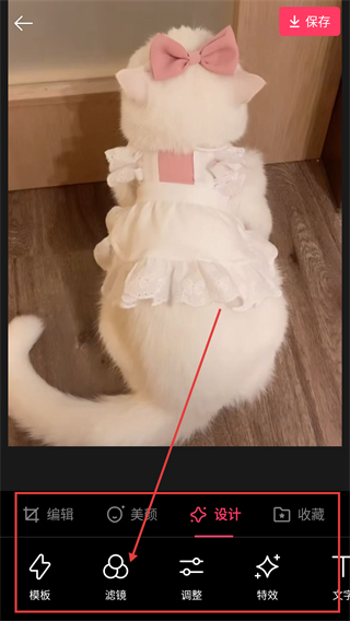 2、进入照片编辑页后,切换到【设计】栏,点【滤镜】选项,能展开滤镜选择列表来美化图片哦。