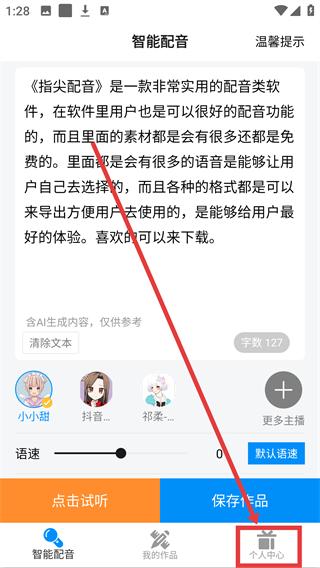 1、在智能配音页面点击底部【个人中心】,进入个人信息页面,可查看账号相关功能哦。
