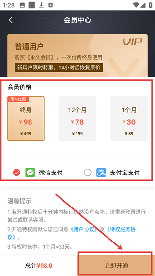3、在会员中心选择心仪套餐,比如终身会员,选好支付方式后点击【立即开通】哦。