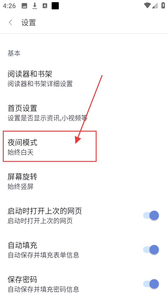 3、进入设置页面,若想调整夜间模式,点击【夜间模式】,就能弹出夜间模式选择窗口啦。